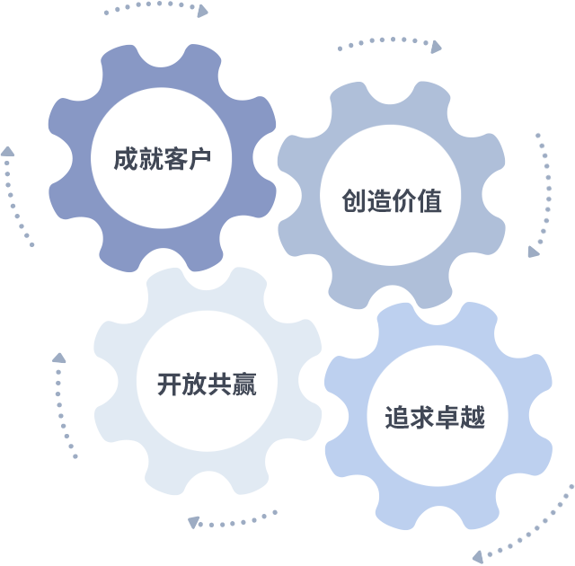 成就客户是一切决策的出发点,,,,创造价值是衡量所有工作的标准,,,追求卓越是我们做事做人的态度,,开放共赢是我们的格局也是最终的结果。。。。价值观的齿轮环环相扣,,,推动着组织里的每个人不断向前。。。。